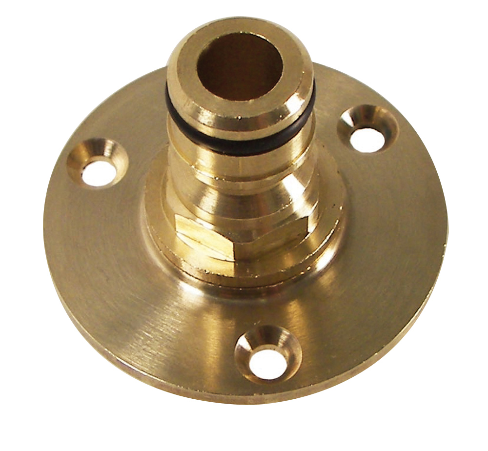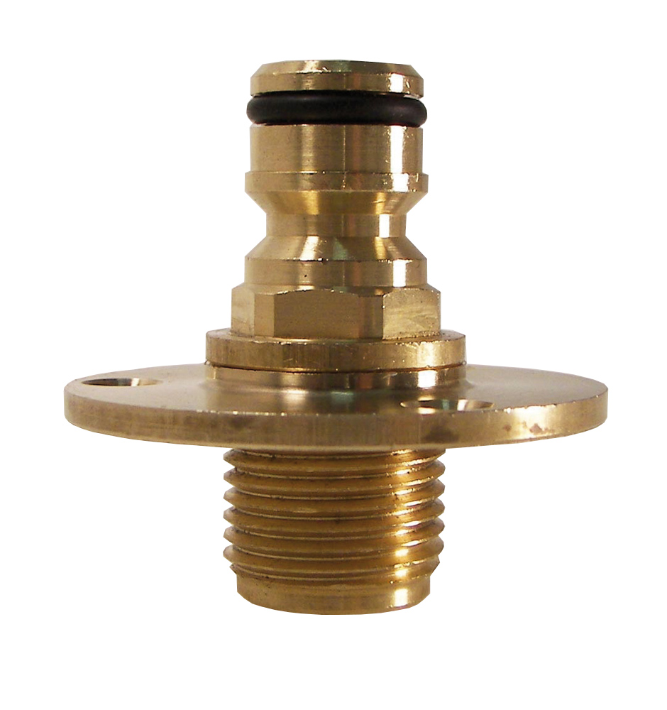 Racor macho de 1/2 ', compatible con todos los sistemas rápidos del mercado en latón y plástico, completo con arandela Ø mm. 50 con tres orificios de fijación, ideal para crear puntos de conexión a mangueras para lavado de cubierta, etc ...