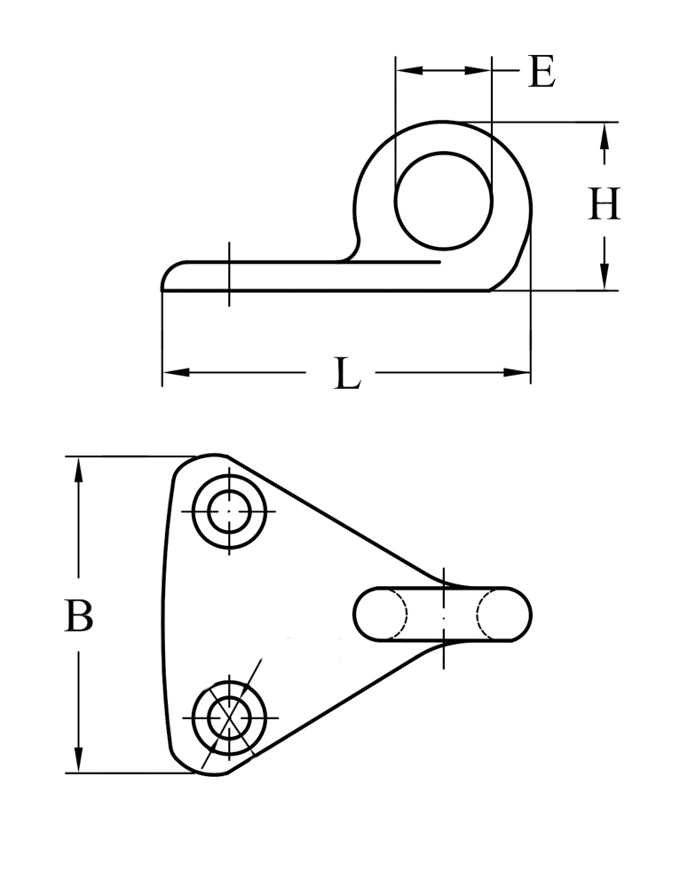 Gancho de acero inoxidable Aisi 316 con anilla. Dim.mm. L = 35, B = 29, H = 22, E = 10.