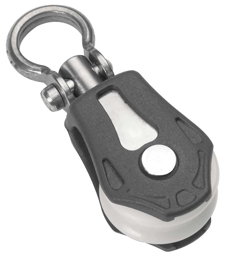 Bloque giratorio simple, Ø cuerda mm. 5, carga máxima de trabajo kg. 275 carga de rotura kg. 550, dimensiones de la polea 20 mm, longitud 54 mm