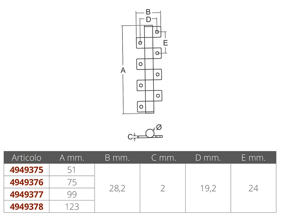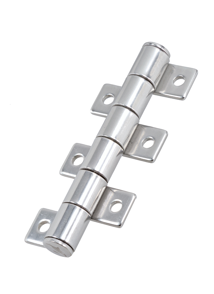 Bisagras de fricción en acero inoxidable AISI 316 de 2 mm de espesor, pasador Ø 9,5 mm. Permiten el control de la apertura de la puerta sobre la que se montan