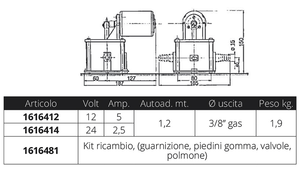 Caudal 10 l / min autocebante 1,2 mt. Ø salida 3/8 "gas peso 1,9 kg, dim.mm. largo 187 mm x ancho 185 x 150 mm