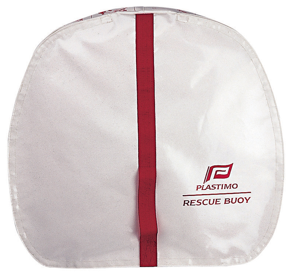 Aro salvavidas de herradura para la recuperación de un hombre al agua, listo para usar, completo con contenedor de lona resistente a los rayos UV con ganchos para el púlpito y 40 metros de línea flotante de polietileno amarillo Ø mm. 7.5. Dimensiones cm. 60H x 65 x 14. Peso kg.2.3