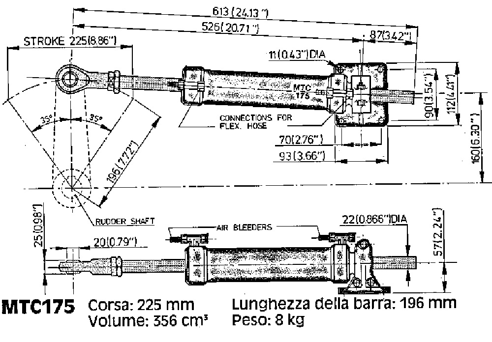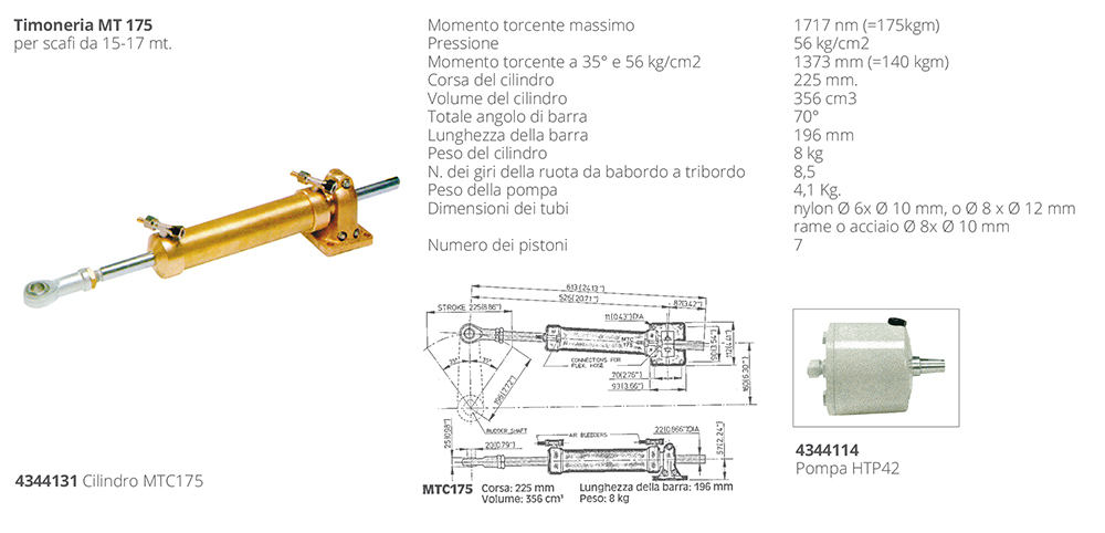 Cilindro MT 175 para sistema de dirección hidráulica Vetus para motores intraborda para cascos de 15-17 metros.