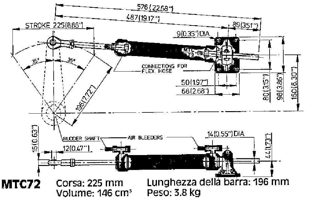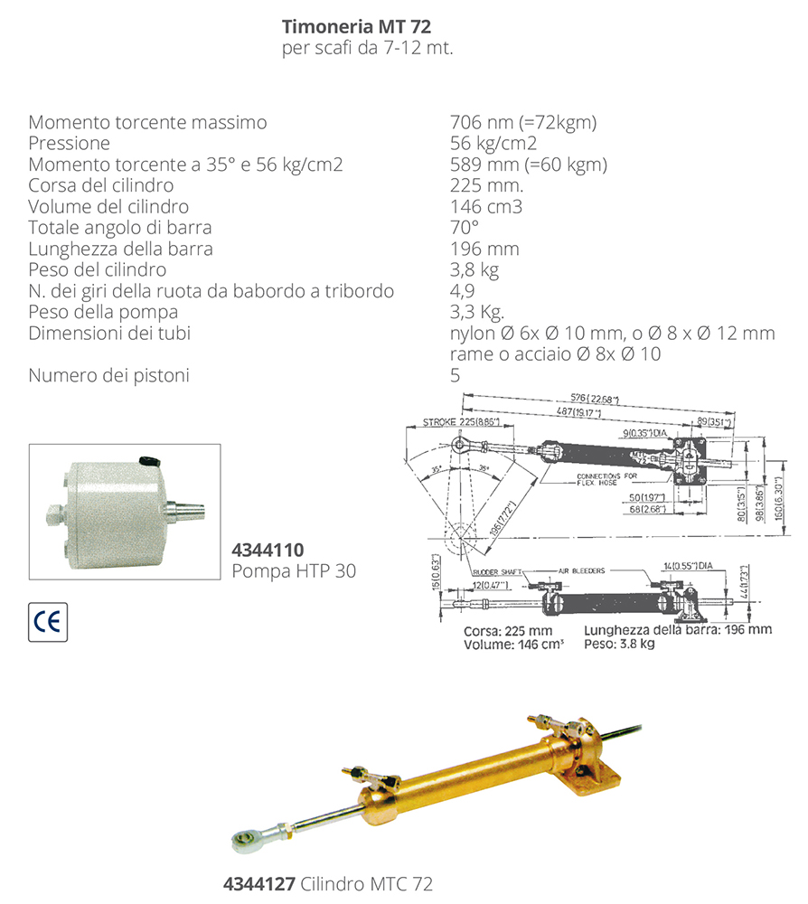Cilindro MT 72 para sistema de dirección hidráulica Vetus para motores intraborda para cascos de 7-12 metros.