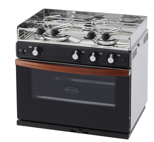 Equipado con termopar de seguridad, protectores de llama laterales, quemadores de hierro fundido, tope antivuelco, cierre de puerta del horno y soporte cardán (basculante).