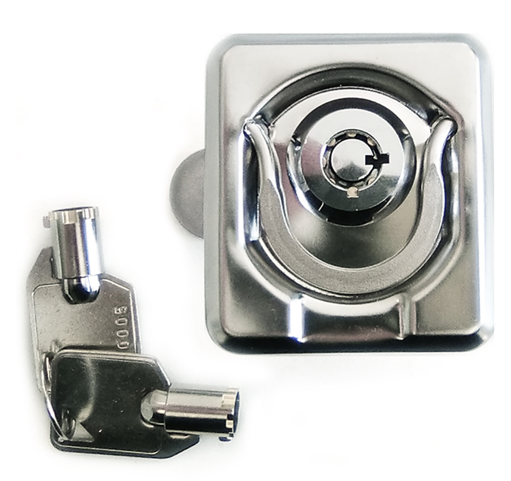 Cerradura empotrada en acero inoxidable, con manilla y cilindro a ras. Dim. Mm. 52x49.