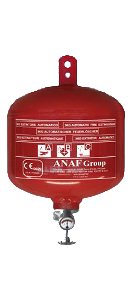 Extintor automático de polvo, equipado con manómetro, clases de fuego abc, instalación en techo, se abre automáticamente a una temperatura de 68 °, Ø 180 mm xh 280 mm