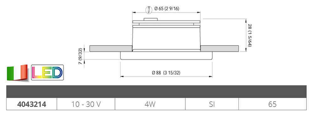 Foco estanco IP65 en acero inoxidable AISI 316 pulido de alta luminosidad (252 Lumen), luz blanca cálida, regulable, sensible a la polaridad. Fuente de alimentación 10-30v, dim. Ø mm. 88, Ø agujero dim.mm. 65, profundidad 28 mm. Fijación con tornillos