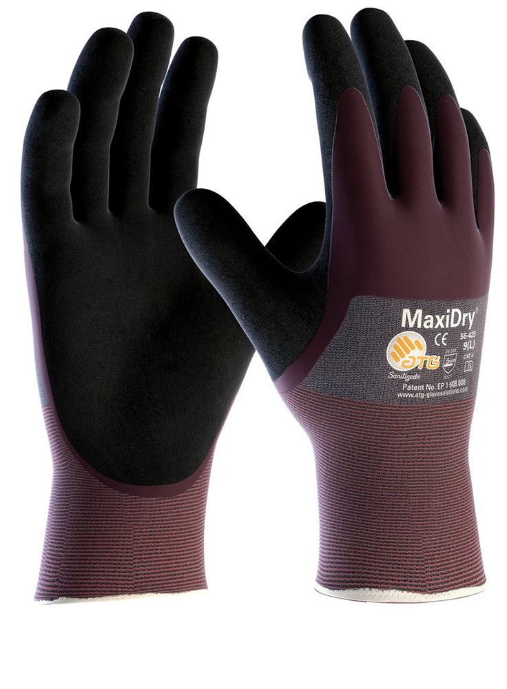 Guantes de trabajo con revestimiento sintético combinados con un forro de hilo continuo sin costuras, diseñados para la protección de aceites y para un agarre efectivo en ambientes húmedos. Longitud 25 cm. Color púrpura / negro