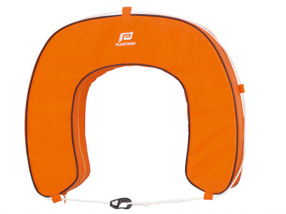Boya de herradura con funda de espuma de polietileno flotante extraíble (147 N) con gran apertura adecuada para todos los tamaños de cuerpo. Confeccionado con tejido lavable de alta resistencia (1100 decitex, recubierto de PVC) y cierre de cremallera. Dimensiones cm. Alto 53 x Ancho 62 x Espesor 11