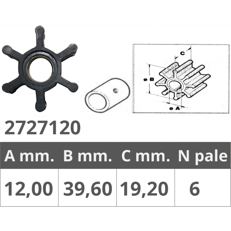 Dim. Ø int.mm. 12 Ø exterior 39,6 mm espesor 19,2 mm, 6 palas. También se puede utilizar para motores VOLVO ref. 875583-7 / 3586496, WESTERBEKE ref. O 32620