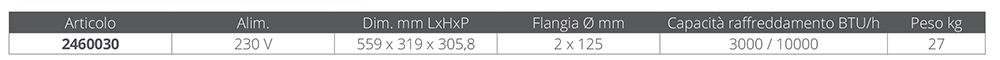 Kit Compact 10K VSD el compresor varía su velocidad de rotación para adaptarse continuamente a la temperatura ambiente y la temperatura programada, con el fin de reducir el consumo eléctrico. Ventilador de aspa invertida sin escobillas controlado electrónicamente, válvula de expansión electrónica; Refrigerante R410A. Características: 1 - Eliminación de picos de corriente en la puesta en marcha 2 - Máxima eficiencia energética: reducción del consumo eléctrico (-40%) 3 - Funcionamiento con pequeños generadores de potencia reducida 4 - Ruido y vibraciones del compresor casi nulo 5 - Temperatura del aire de salida constante 6 - Conexión wifi para teléfono inteligente disponible a través de una aplicación dedicada 7 - Rejilla de entrada de aluminio NOVA-R 250 x 150 8 - Bomba centrífuga 15 l / min - Rosca de 3/4 "9 - Kit de prensaestopas 1/2" 10 - 5 m manguera reforzada transparente, int. Ø mm 16 11 - Conector de manguera 3/4 ”mm 16 recto 12 - Manguera aislante flexible mt 10, int. Ø mm 125 13 - 2 plenum mm 200 x 100, conexión mm 125 14 - 2 rejillas de salida en aluminio anodizado mm 200 x 100 15 - Desviador Y mm 125 entrada, mm 125/100 salida 16 - Adaptador rejilla redonda de 5 "a 4" 17 - Rejilla blanca redonda fija con conexión mm 100