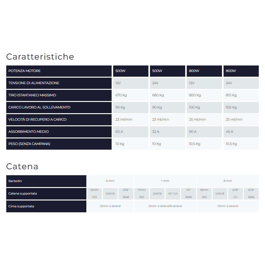 El molinete SMART-V puede usar cadenas de 6 mm u 8 mm. Todos los modelos están equipados con un sistema tensor.