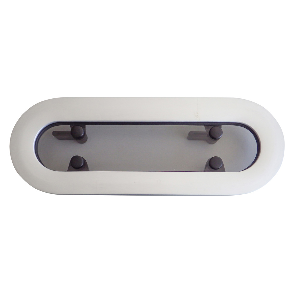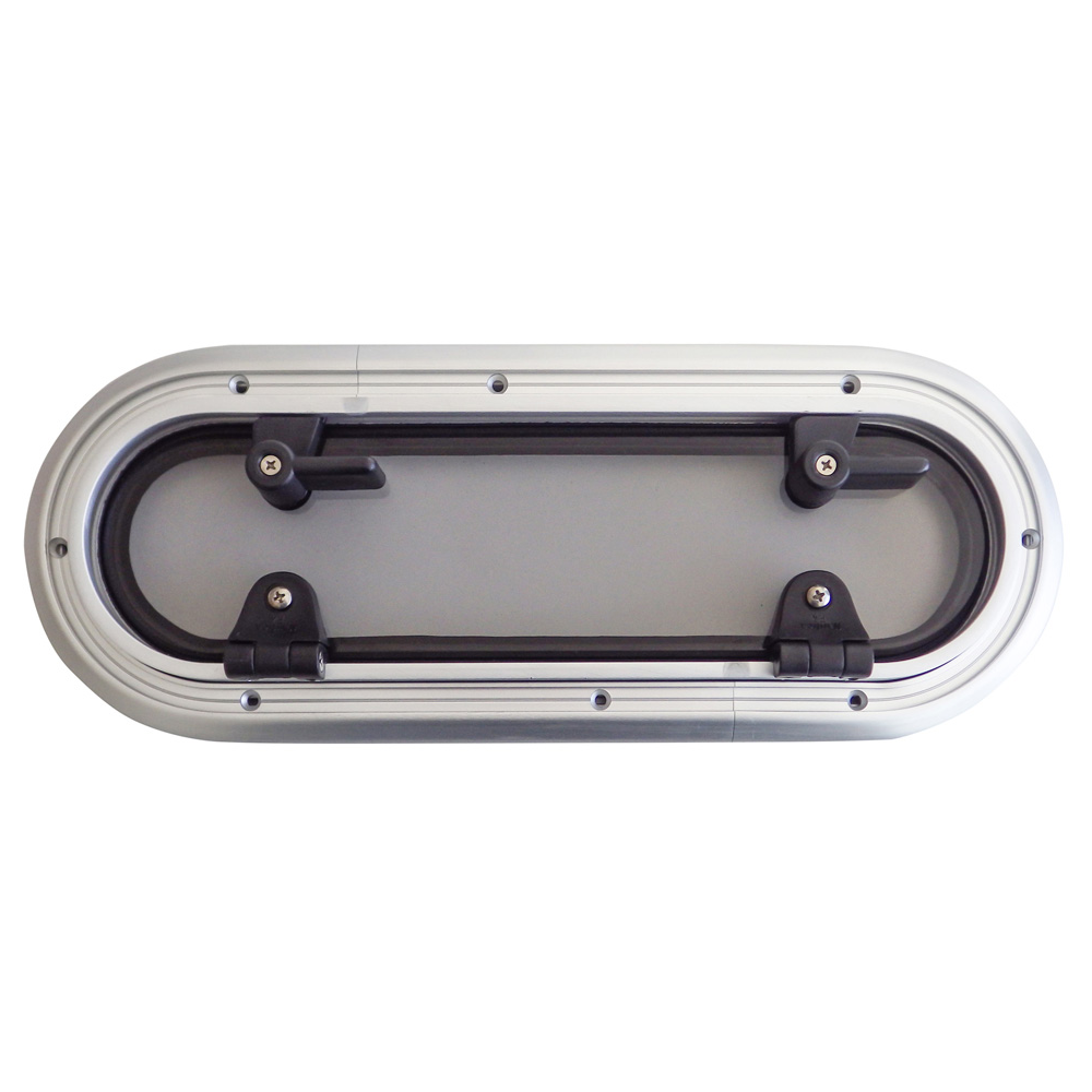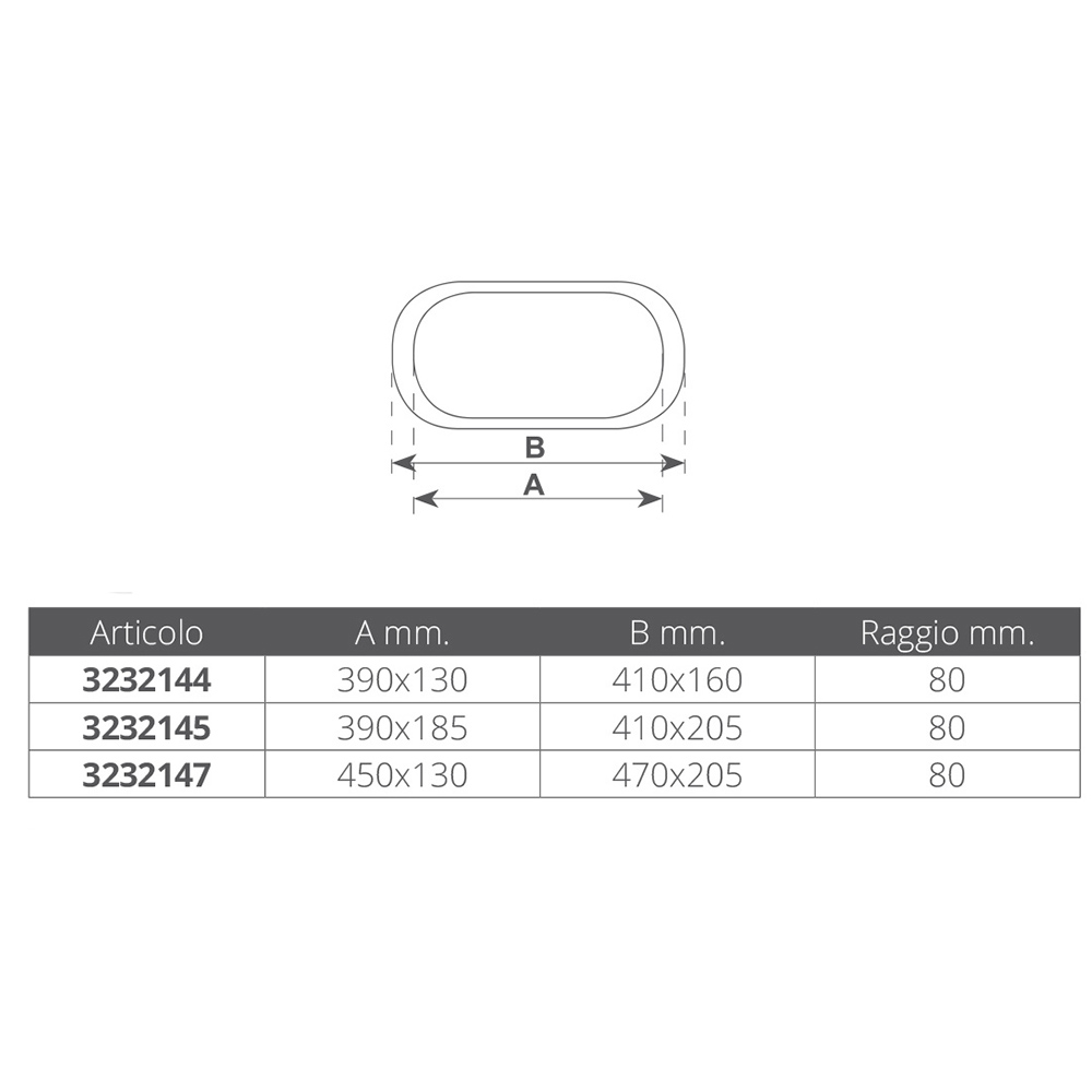 Portilla de apertura semielíptica en aleación ligera anodizada, con bisagra de fricción para bloquear la apertura en la posición deseada. Metacrilato mm. 10. Tamaño de corte de arte. 3232144 mm. 390x130, art. 3232145 mm. 390x185, art. 3232147 mm. 450 x185