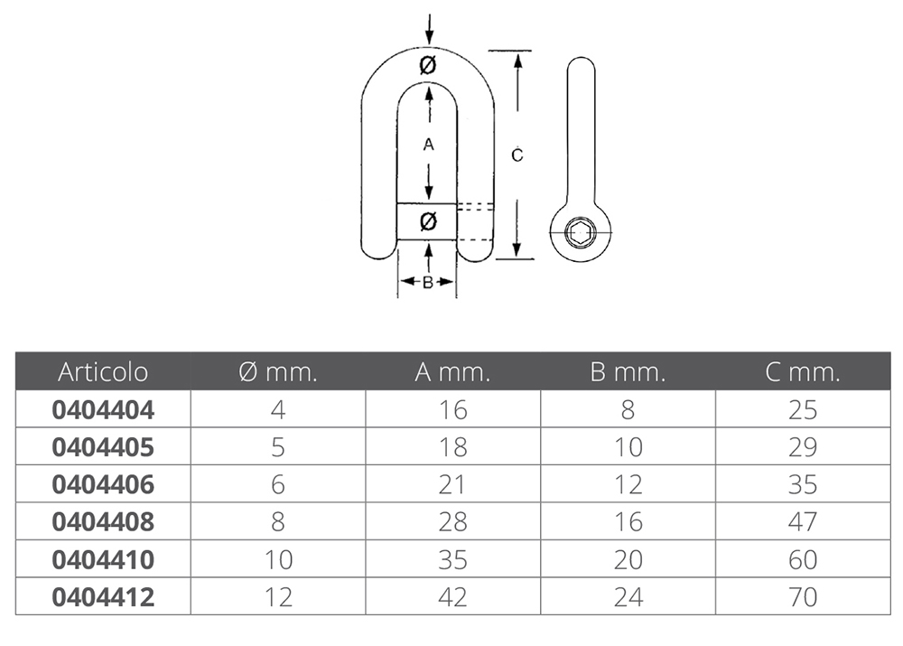 Grillete en acero inoxidable AISI 316 con pasador para anclajes. Dimensiones: Ø 6 mm. A 21 mm. B 12 mm. C 35 mm.