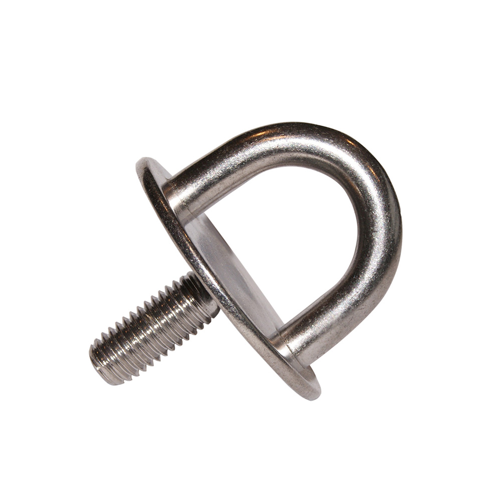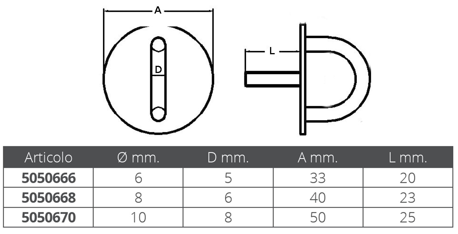 Placa redonda en acero inoxidable AISI 316 con perno en U y espárrago. Dimensiones: Ø 6 mm. D 5 mm. A 33 mm. L 20 mm.