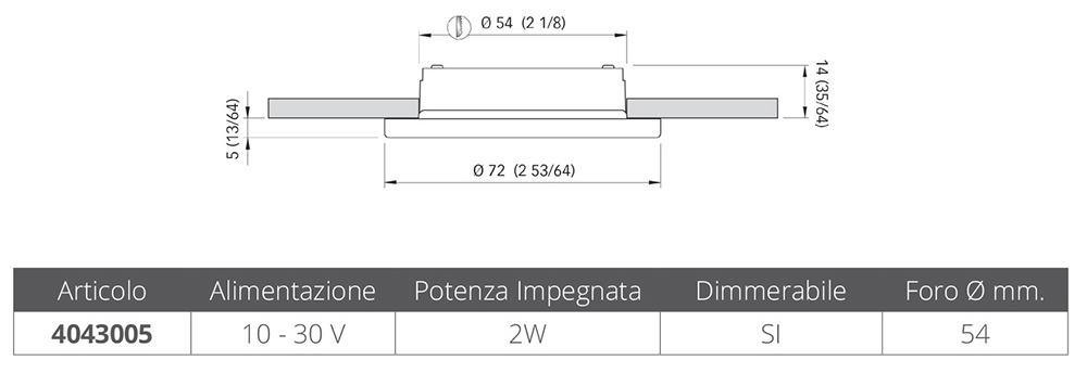 Foco estanco IP66 con 2 leds (105 Lumen), alta luminosidad, luz blanca cálida con marco circular de plástico con acabado blanco RAL 9010, regulable, sensible a la polaridad. Fuente de alimentación 10-30v, Ø exterior mm. 72, agujero Ø mm. 54, profundidad 14 mm