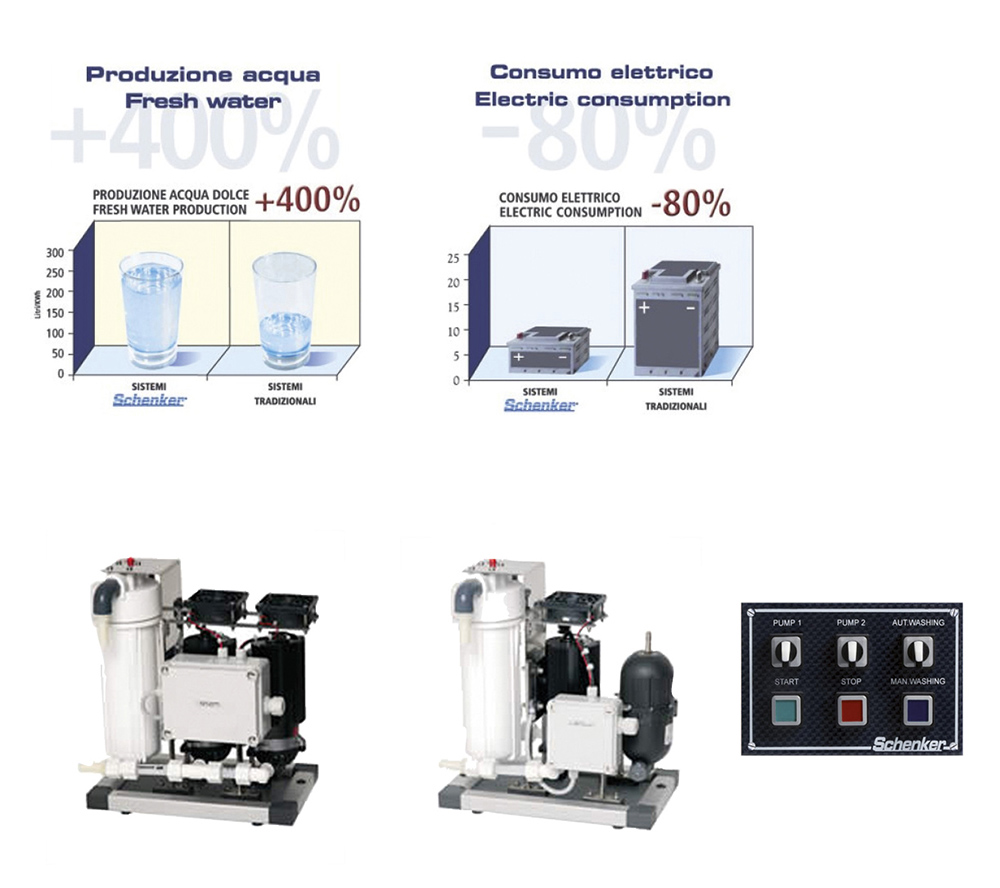 Los desaladores de nueva generación transforman el agua de mar en agua dulce pura, utilizando solo una pequeña cantidad de electricidad (poco más que una bombilla). Simples, compactos, silenciosos, fáciles de instalar, tienen la ventaja del consumo eléctrico, el cual es más de un 80% menor que los sistemas tradicionales, permitiendo energía directa de las baterías, sin necesidad de generador. No necesitan operaciones de mantenimiento especiales más que enjuagar el sistema con agua dulce (necesario si no planea reactivar el sistema antes de los 10-15 días). Se suministra completo con panel que elimina la necesidad de cualquier operación manual. Todo el sistema está gestionado por un microordenador que realiza automáticamente todas las funciones, incluido el lavado con agua dulce. El pequeño panel, disponible en versión analógica o digital, incluye todos los controles y puede montarse directamente en el sistema o en cualquier lugar del barco.