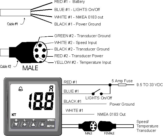 Los datos de velocidad, registro y temperatura del agua se transmiten en la salida NMEA 0183 del SLT110. La información ASCII se puede utilizar para obtener un historial de rendimiento o repetir información en una pantalla remota. Fuente de alimentación 12/24 Vdc. Salida NMEA 0183.