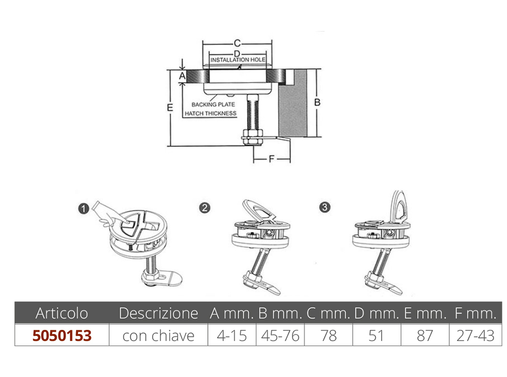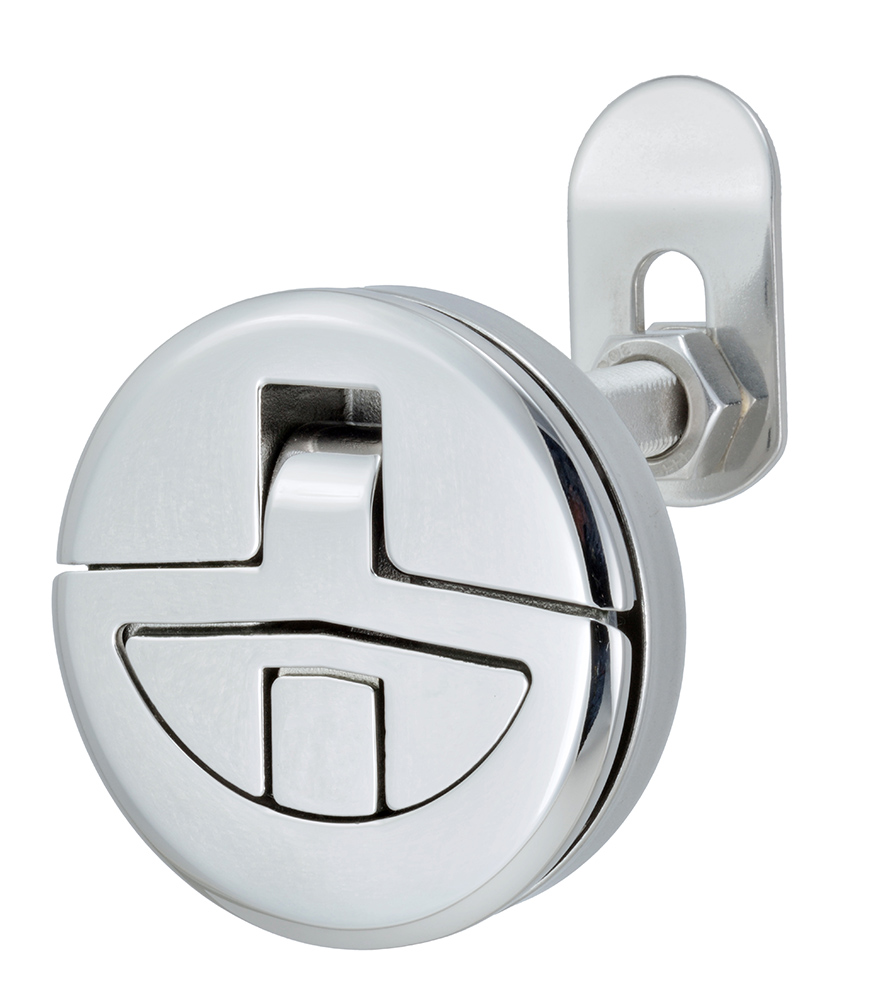 Levantador de hojalata en acero inoxidable AISI 316 con botón de "liberación" del mango y / o liberación del vástago que alejándose del lado de fijación permite no dañar la fibra de vidrio o la madera al abrir / cerrar