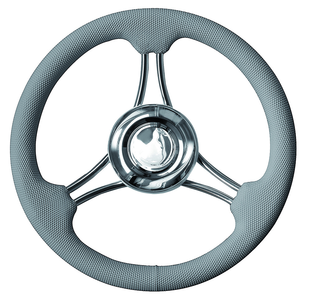 Volante de tres radios con empuñadura y radios en acero inoxidable revestido con poliuretano blando, cono universal