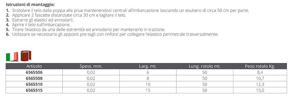 Cubierta náutica interior - Versión con elástico. Vendido por rollo Su peculiaridad son las 2 bandas elásticas aplicadas lateralmente a lo largo de toda la longitud, diseñadas para facilitar y reducir el tiempo de instalación. Instrucciones de montaje: 1. Desenrollar la tela desde la popa hasta inclina mientras permaneces en el centro del bote dejando un exceso de aproximadamente 50 cm a cada lado. 2. Aplique 2 abrazaderas espaciadas a unos 30 cm de distancia y corte la hoja. 3. Retire las bandas elásticas y anúdelas. 4. Abra la hoja en el bote. 5. Tire del elástico en un extremo y anúdelo para mantenerlo en tensión. 6. Si es necesario, utilice los precortes especiales con refuerzos para conectar el perímetro elástico en cruz.
